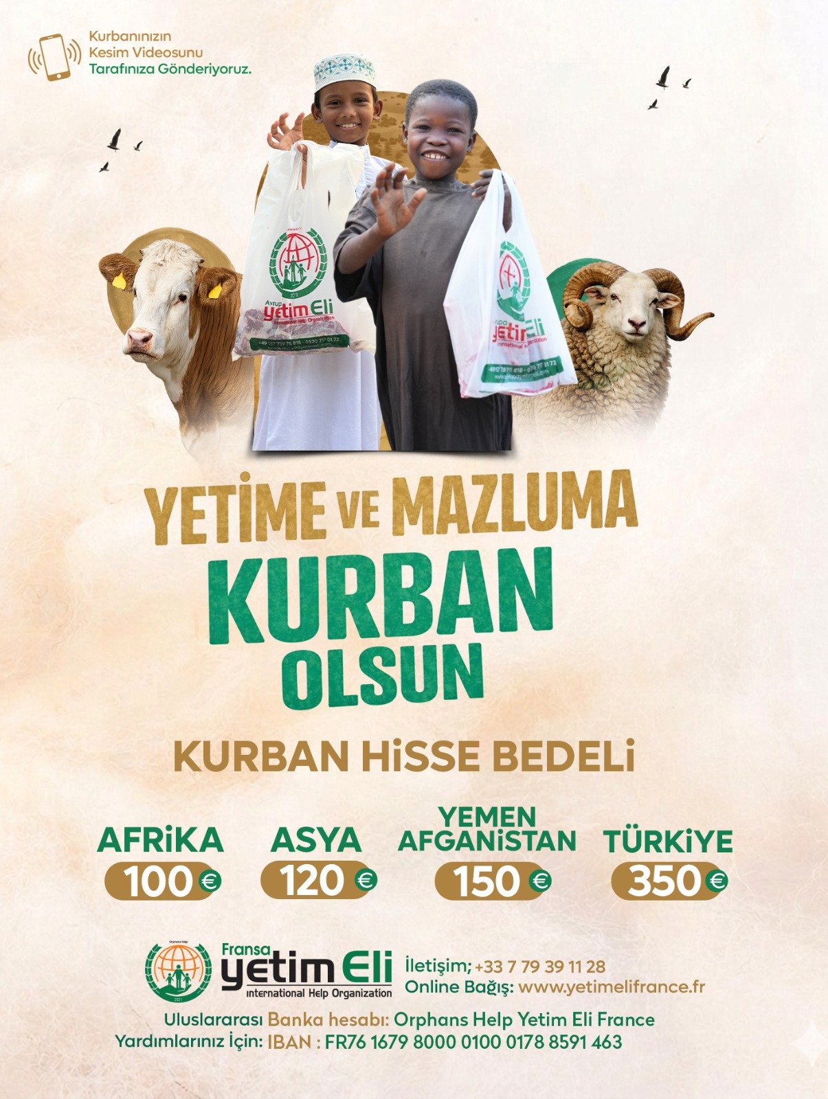 Fransa Yetim Eli olarak, Afrika’nın en ücra köylerinden, mülteci kamplarına kadar uzanan geniş bir coğrafyada, sizin adınıza kurban kesimi ve dağıtımını gerçekleştiriyoruz. Vacip, adak, akika, şükür veya sadaka kurbanlarınızı, İslami usullere uygun şekilde alıyor, güvenilir vekalet sistemimizle kesiyor ve ihtiyaç sahiplerine ulaştırıyoruz. Her bir kurban, bir aileye et ihtiyacını karşılamanın ötesinde, umut, sevgi ve dayanışma mesajı taşıyor.